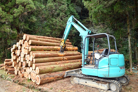 伐採(収穫)した丸太は、ケーブルなどで吊るして山から林道まで運び出されたり、ウインチで引っ張ったりして搬出されます。積みおろし機などで集めてトラックに積み込まれ、原木市場や貯木場へ運ばれます。原木市場や貯木場へ運ばれた木材は競りで製材業者に買われます。また、直接製材工場に運搬される場合もあります。